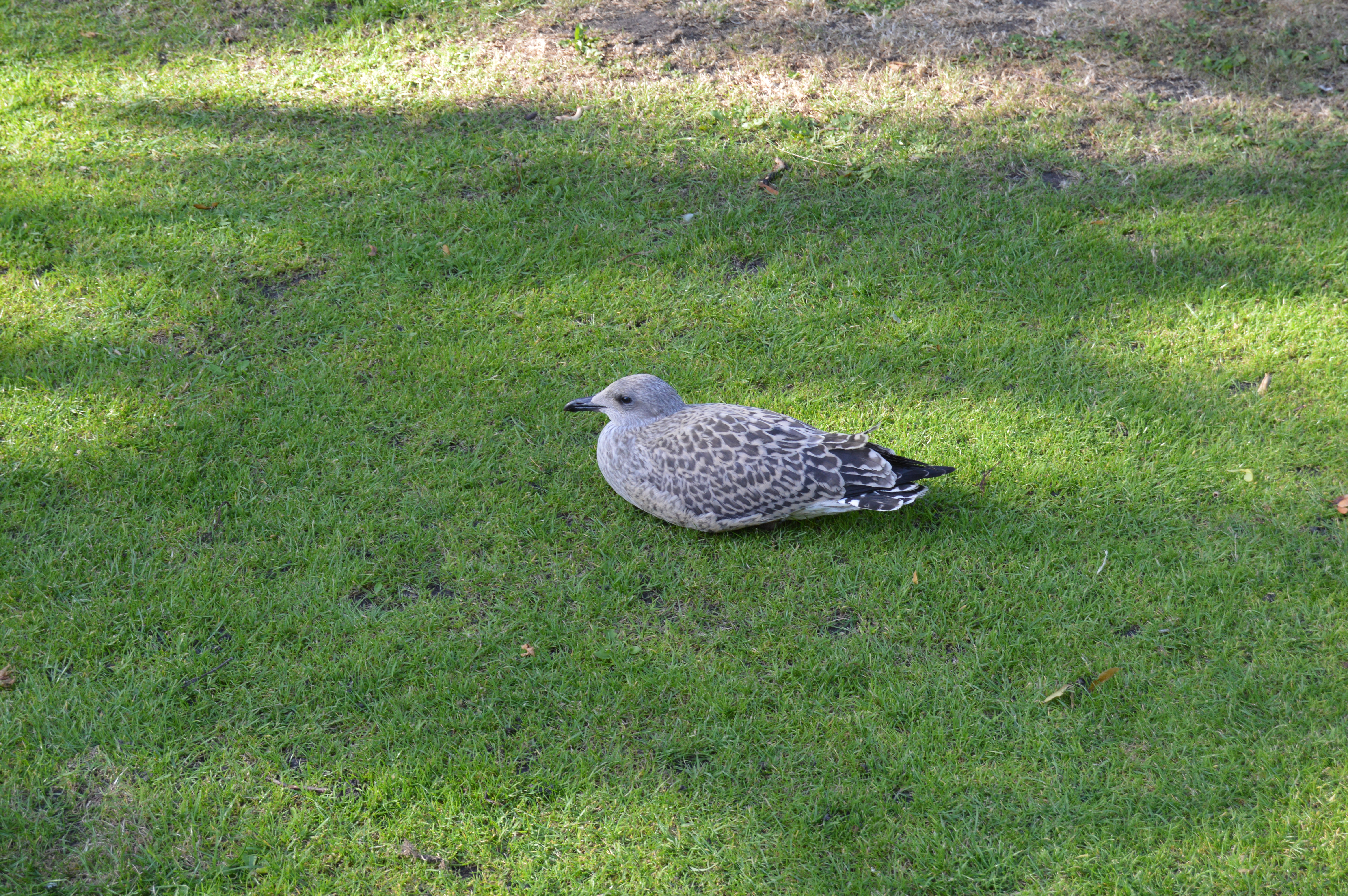 A baby seagull was resting, a squirrel was enjoying an acorn.