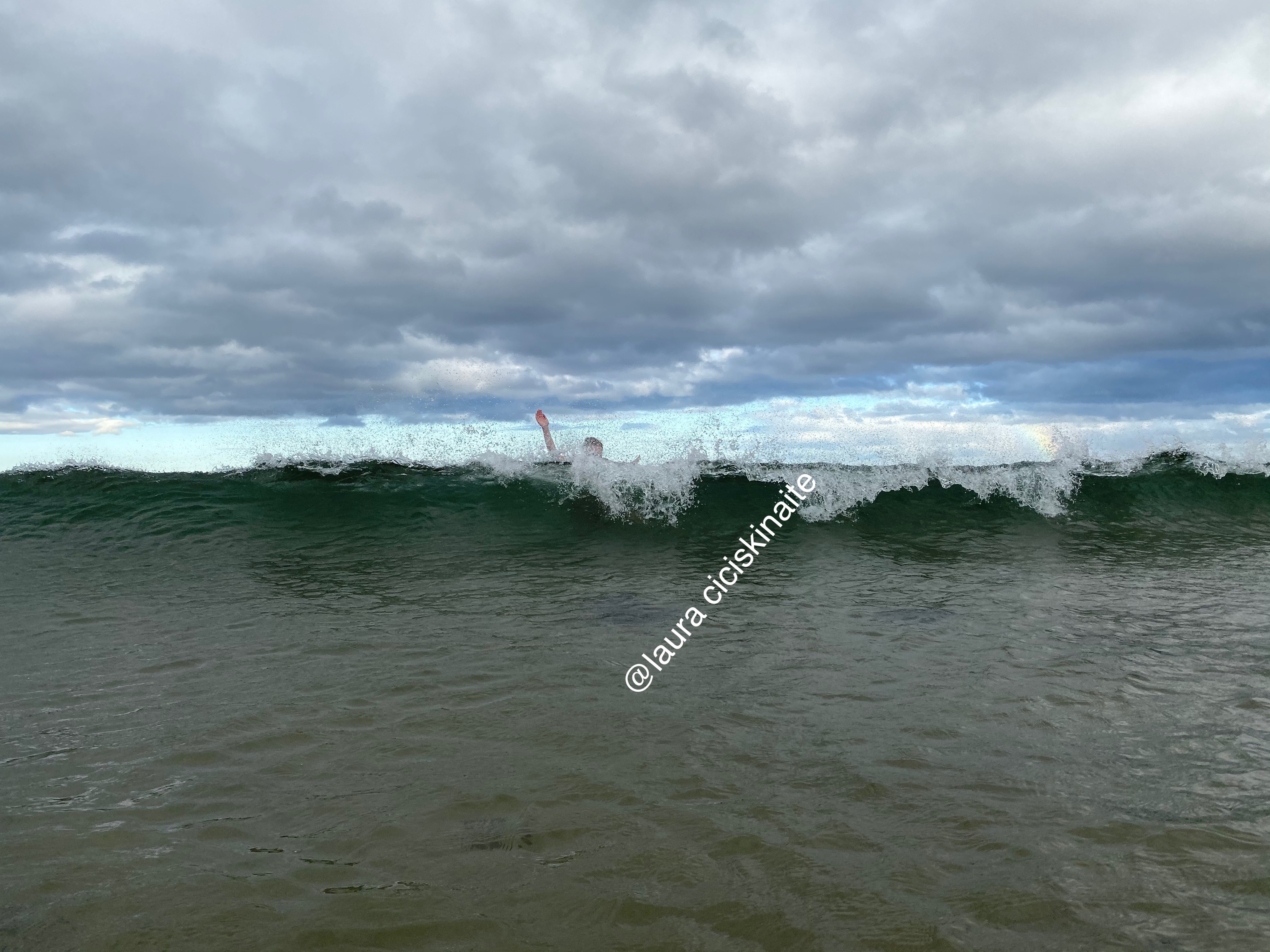 The photo you see above is me in the waves of Northern Sea and in the background there is a rainbow, maybe not very visible although it is there, water covered it.