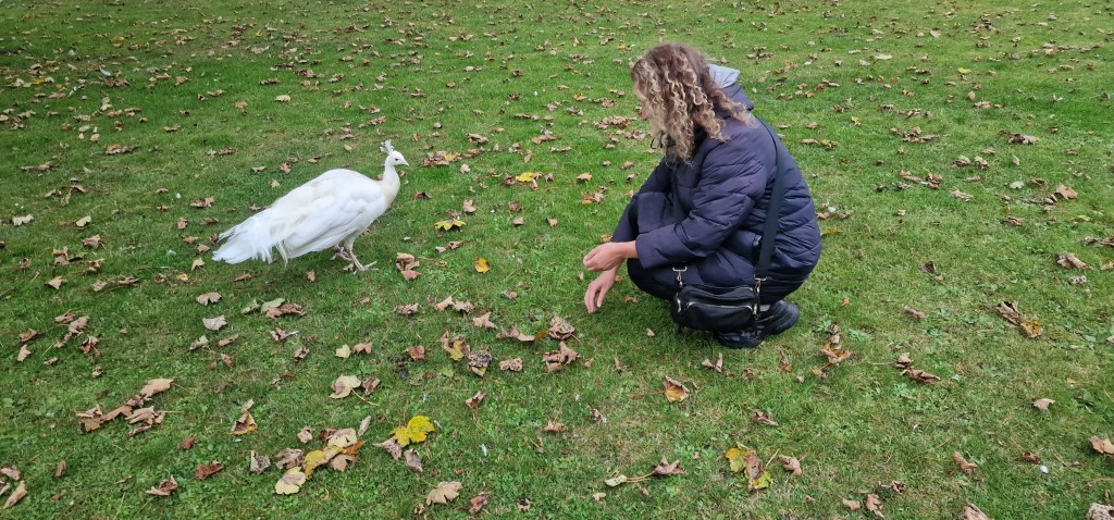 In the picture above me meeting white peacock. Interesting encounter. When peacock walked away, it flew up the tree to see it’s friend in the tree. I looked up to see other peacock and little white feather fell of the peacock, straight into my hand, of cource I kept the feather…